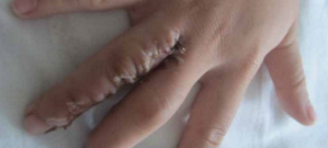 治果:经过治疗后10天左右,小浩浩 的手指可以拆线了,经过术后的康复锻炼手指也基本恢复正常,疤痕也越来越淡了,经过回访,出院以后的小浩浩也并没有出现其他并发症。(如下图:治疗前后图片对比)