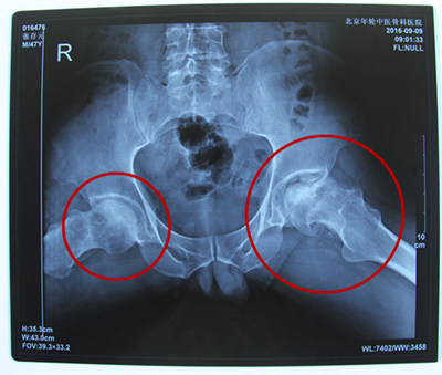 病情描述:患者于5年前无明显诱因开始出现双髋关节腹股沟区疼痛,表现为隐痛,行走跛行,于久行及劳累后加重,就诊于当地医院,诊断为“双侧股骨头缺血性坏死”,间断口服中药药物治疗2周,左髋关节缓解不明显,2013年北京积水潭医院给予通络生骨胶囊口服治疗左侧髋关节疼痛,状况稍有好转,2016年初武警北京二院行介入治疗,效果一般。后因状况剧烈疼痛影响正常生活,选择到医院进行治疗。